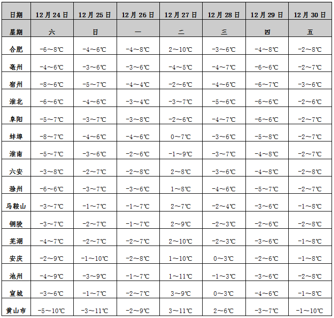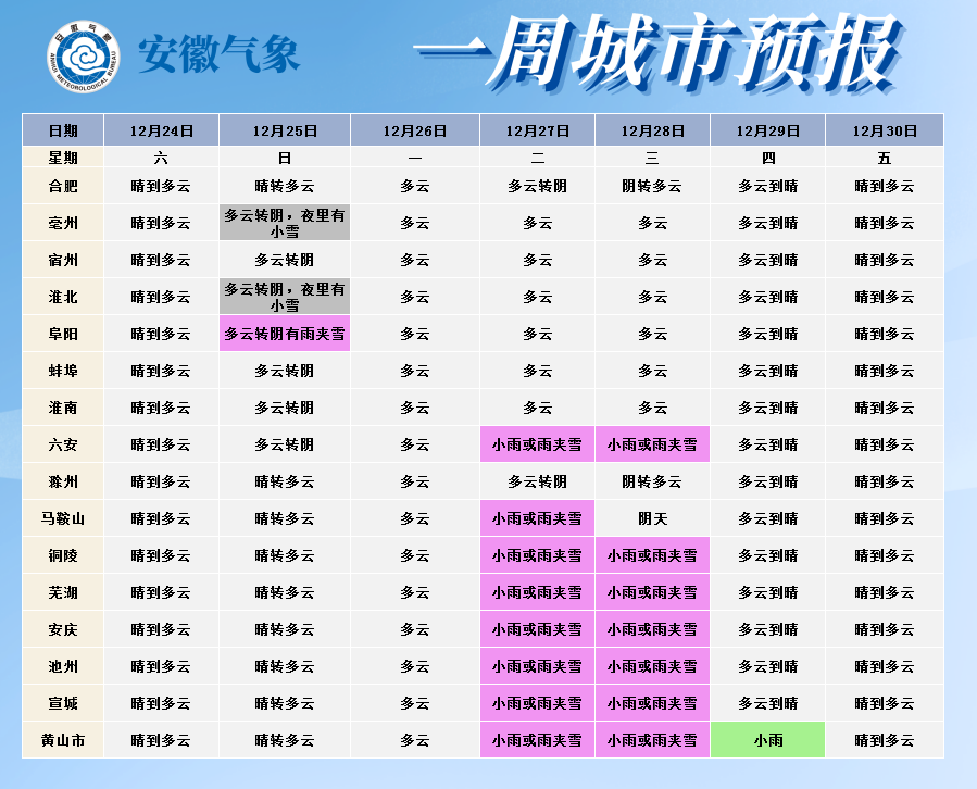 12月24日,安徽气象微信号发布未来一周全省天气预报: